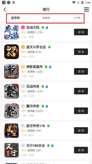 6、进入“排行”可以看到“推荐榜”“新服榜”和“人气榜”,大家可以参考一下这些榜单看看有没有自己喜欢的游戏。