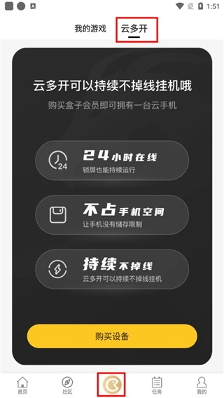 10、进入“在玩”平台支持用户开通云多开功能,开通后持续在线不掉机。