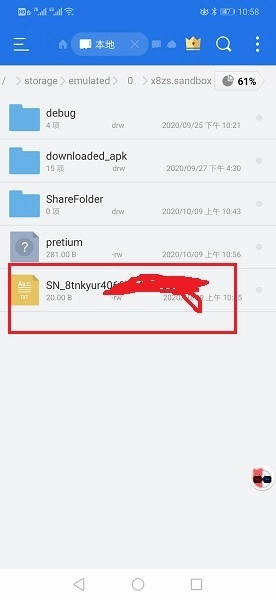 借助 ES 文件管理器或与之类似的文件工具,进入手机的 sd 卡目录,找到名为 SN_XXXXX.txt 的文件,该文件内的那串字符即为 SN 码。将其复制后,前往上图所示的界面,利用 SN 码重新进行激活操作。