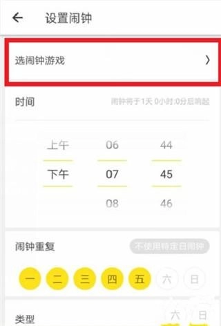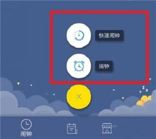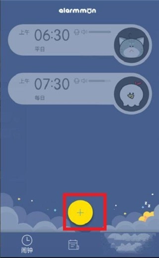 1、打开“怪物闹钟”的初始界面,黄色圆圈内即为设置闹钟的入口,提供快速版和日常重复版两种选项,您可根据需求选择并点击进入。