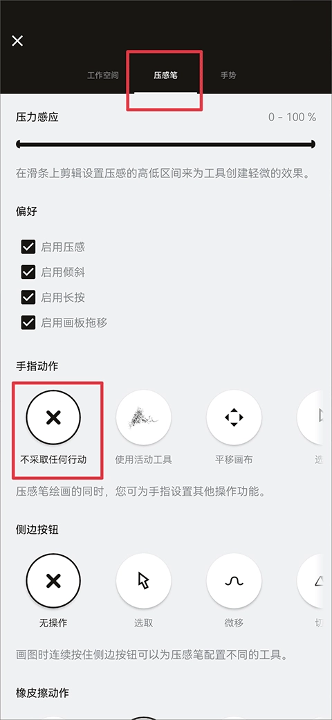 3、最后在压感笔界面的手指动作设置里,选择“不采取任何行动”就能完成关闭操作。