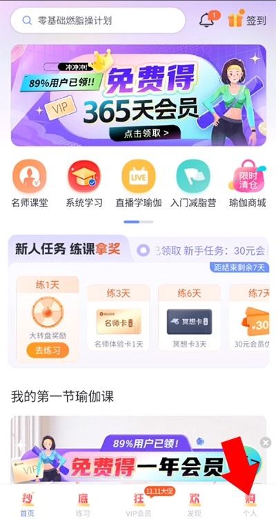 1、在本站下载并安装每日瑜伽应用,进入主界面后,点击右下角的“个人”选项