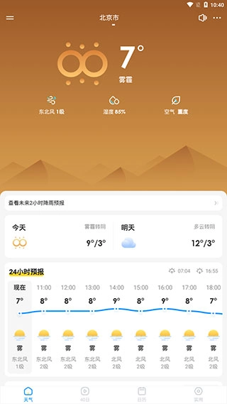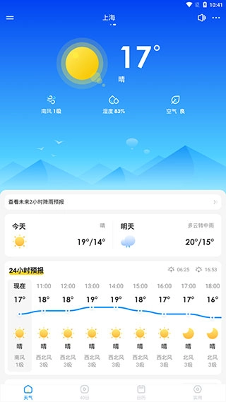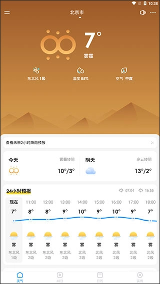 进入幸福天气应用后,界面最上方呈现的是当日天气状况,其下方则展示着未来24小时的天气预报。