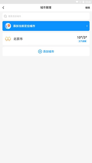 2、接着会进入到城市管理界面,再点击下方的【添加城市】。
