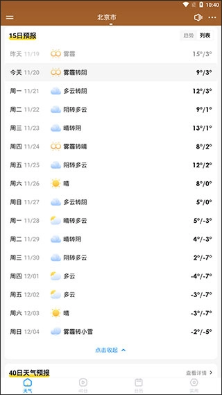 3、展开下拉后,就能查询15天的天气列表了。