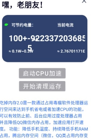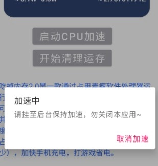 4、点击加速后需保持后台运行哦,若手机发烫较严重,建议多次点击;大家可以通过CPU检测软件和耗电工具直观看到本软件的优化效果。