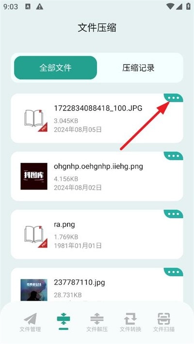 2.然后点击要压缩的文件右上角的【菜单】图标。