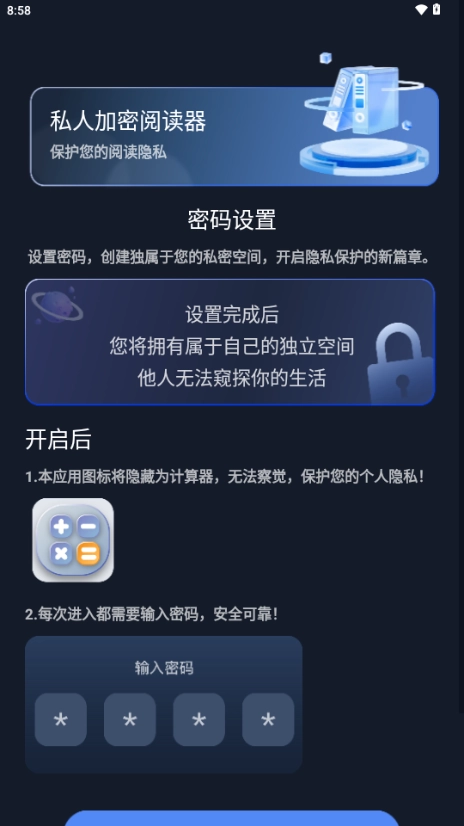 私人加密阅读器是一款本地小说阅读工具,用户可通过设置密码将其变为隐藏的小说阅读空间,还能自定义图标外观,打造专属的隐私阅读环境,全方位守护你的小说阅读隐私。