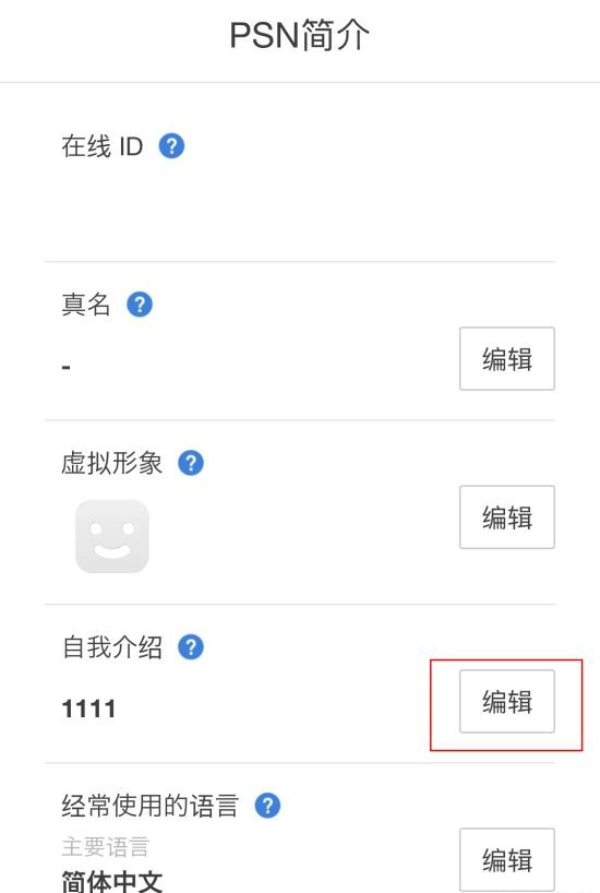 “自我介绍”点击“编辑”按钮,将“PSN认证码”填入“个人介绍”,点击保存