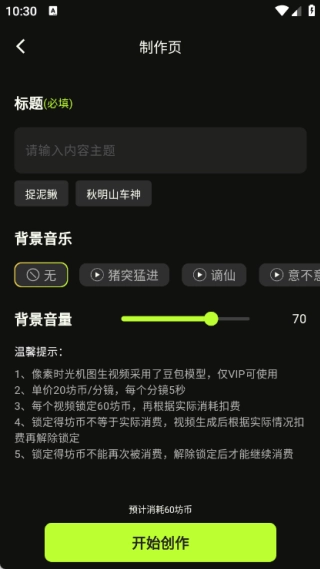 3、在像素时光机的制作页面输入内容主题,选择背景音乐与背景音量,随后点击创作按钮,就能快速完成创作。