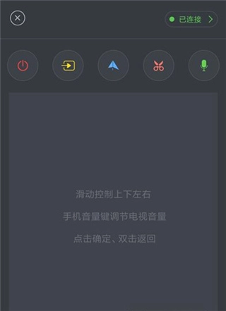 3、待连接成功后,会弹出遥控器界面。通过滑动操作可控制电视的上下左右方向,手机的音量键能够调节电视音量;点击“确定”键执行确认操作,双击则实现返回功能。界面上方设有多个功能按钮,分别对应电源、投屏、镜像、截屏和语音控制功能,输入指定的语音口令即可对播放进行控制。