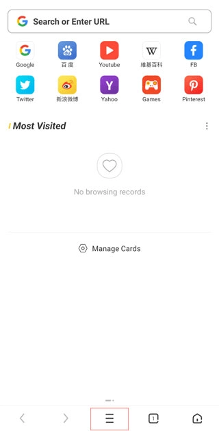 1、在本站安装好uc浏览器后点击应用底部的菜单按钮;