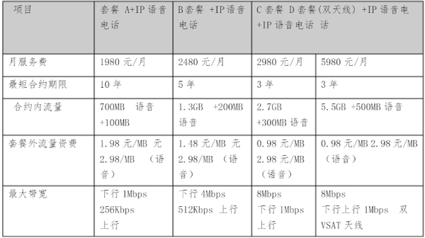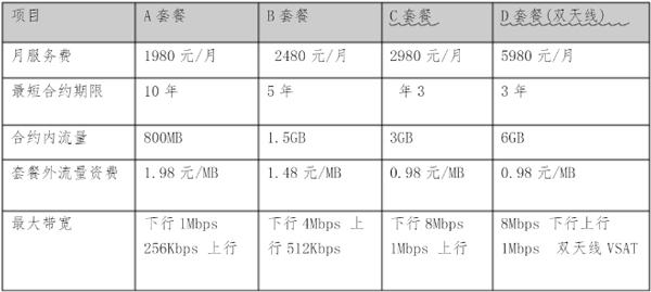 1、宽带卫星网络服务套餐资费表