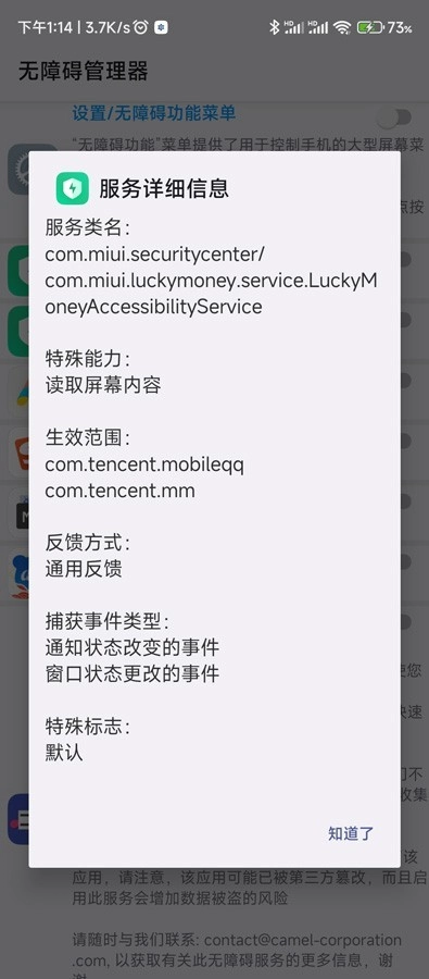 2、可查看某项无障碍服务的详细信息(如是否可以读取屏幕内容、是否可以拦截按键事件等等);