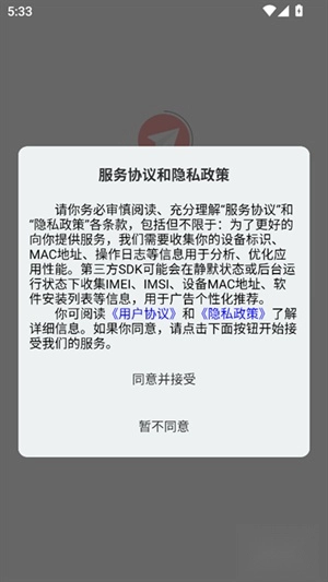 2、初次启动时,需要阅读并同意平台的隐私政策和服务条款。