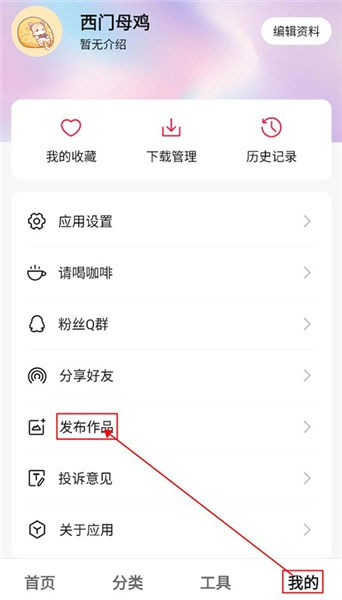 1、用户点击右下角“我的”,进入个人中心,点击中间的“发布作品”即可进入。