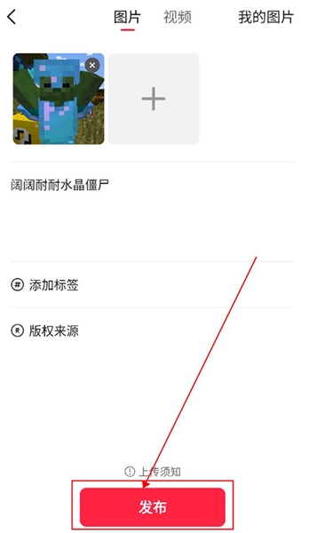 3、需要再填写好图片或视频的内容描述以及标签或来源,点击右上角的“发布”即可。