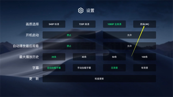 2、软件设置里可以对播放器进行画质选择:最高4K原画;设置开即自启动、自动播放最后观看、自动字幕功能。