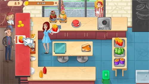 4、玩家需依据点单需求,在场景里选用对应的材料制作食物,制作完成后就能把食物送至客人面前。