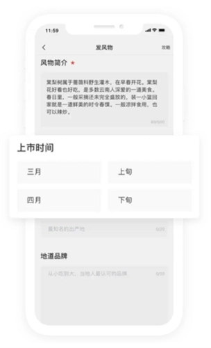 点击首页底部的“+”按钮,进入内容发布页面后,选择“发风物”选项,即可进入风物信息填写界面。