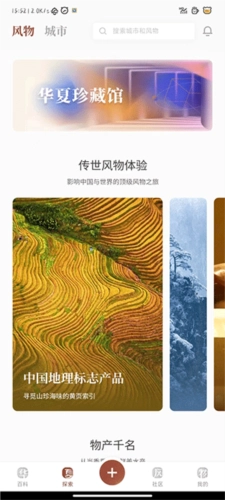 2、探索界面包含两大板块:风物板块可呈现中国地理标志产品、世界遗产在中国、国之重宝等内容,让用户体验传世风物;城市板块则支持标记与分享家乡,或是查找特定地理位置的风物。