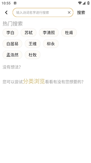 2、在顶部的搜索框中输入你想查找的诗词名称或作者姓名,这里小编就以李白来举例说明;
