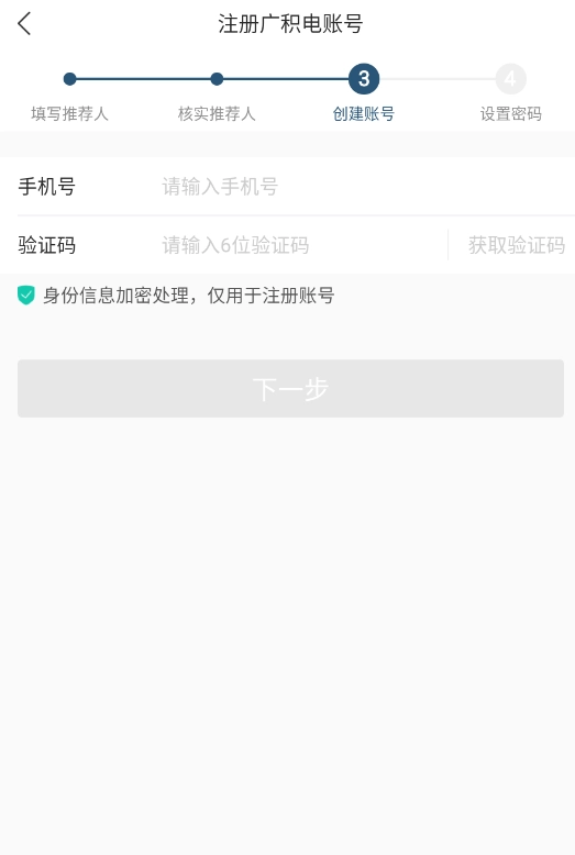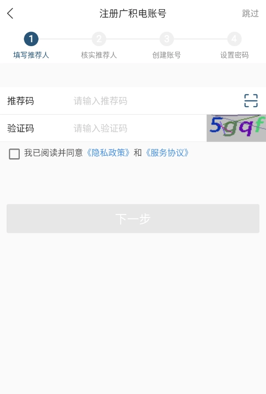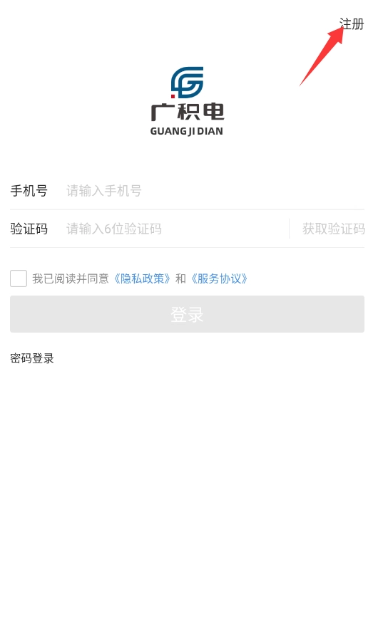1、打开广积电应用后,点击界面右上角的“注册”按钮,即可进入账号创建页面。