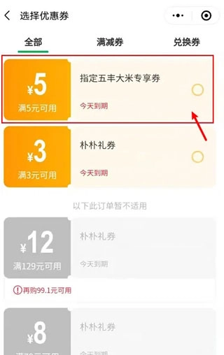 4、在优惠券页面,点击一张优惠券。