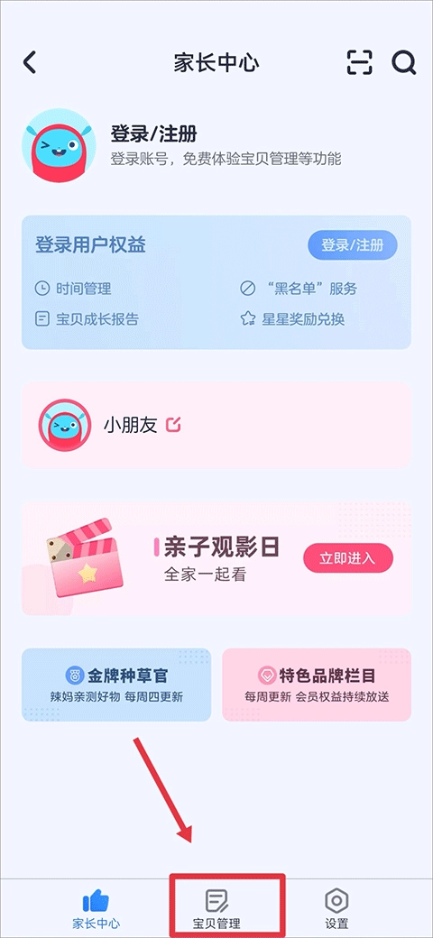 2、在完成家长身份验证后,进入家长中心界面,接着点击宝贝管理选项。
