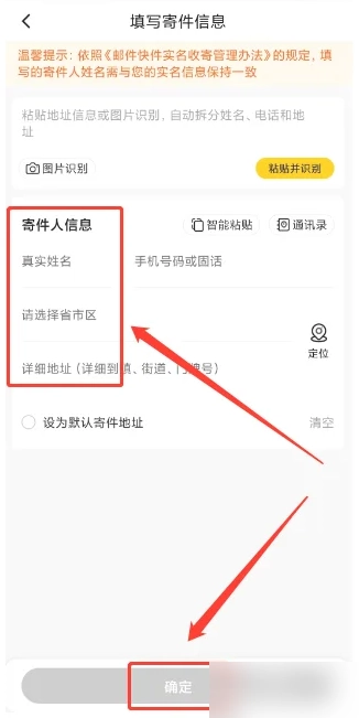 4、进入寄件信息填写页面,输入真实姓名、手机号码、所在省市区及详细地址,确认无误后点击【确定】按钮。
