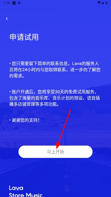 1、打开Lava店铺音乐,点击申请试用;
