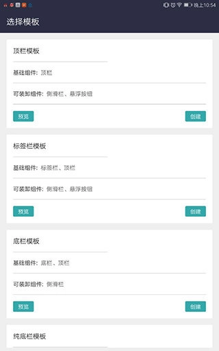2、包含顶栏模板、标签栏模板、底栏模板、纯底栏模板和空白模板这几种类型。可根据自身需求选择,此处选用了顶栏模板。接着输入应用名称,点击创建按钮即可。