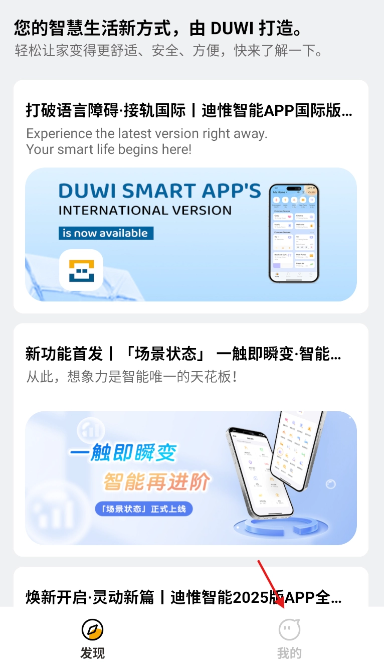 1、打开迪惟智能进入主界面,轻点底部 “发现页”,找到并点击 “我的” 选项。