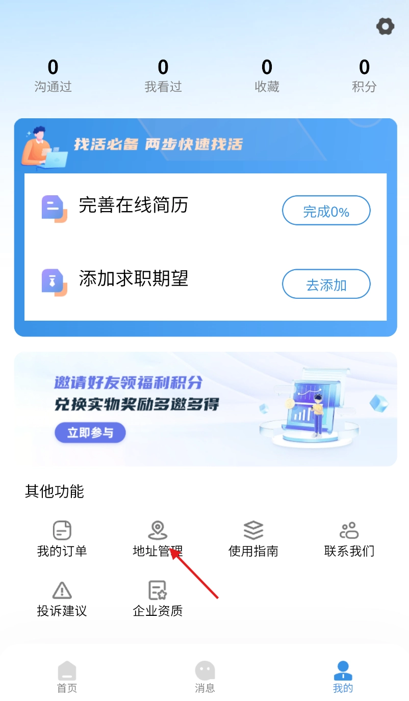 2、进入个人页面后,向下滑动找到“其他功能”板块,点击“地址管理”按钮,即可进入地址管理界面。