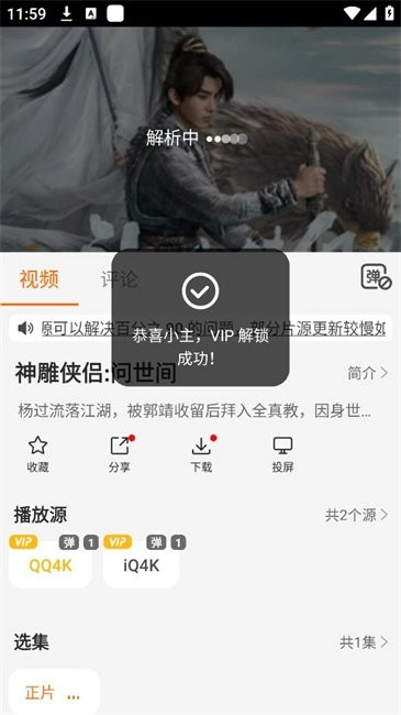 1.有些影视资源的播放源需要会员,点击屏幕中间的“免费解锁VIP”可无需观看广告就能够获取会员