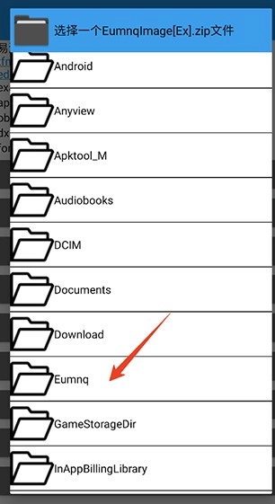 7、进入手机的文件存储目录,找到并选择eumnq文件夹,把刚刚准备好的数据包导入到这个目录里。
