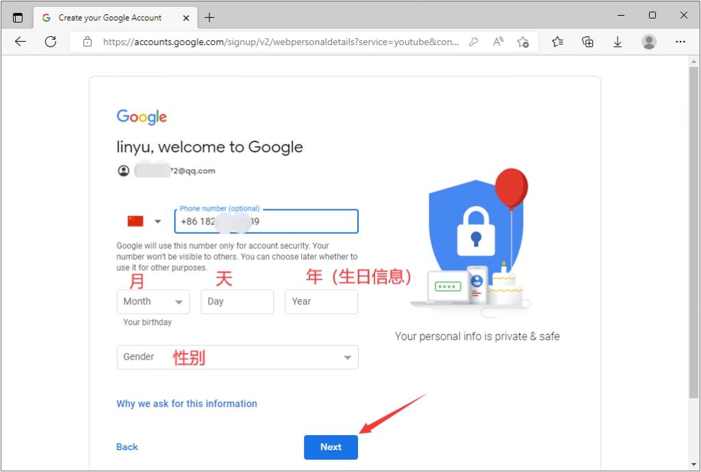 9、输入您的生日信息,包含年、月、日、以及性别。