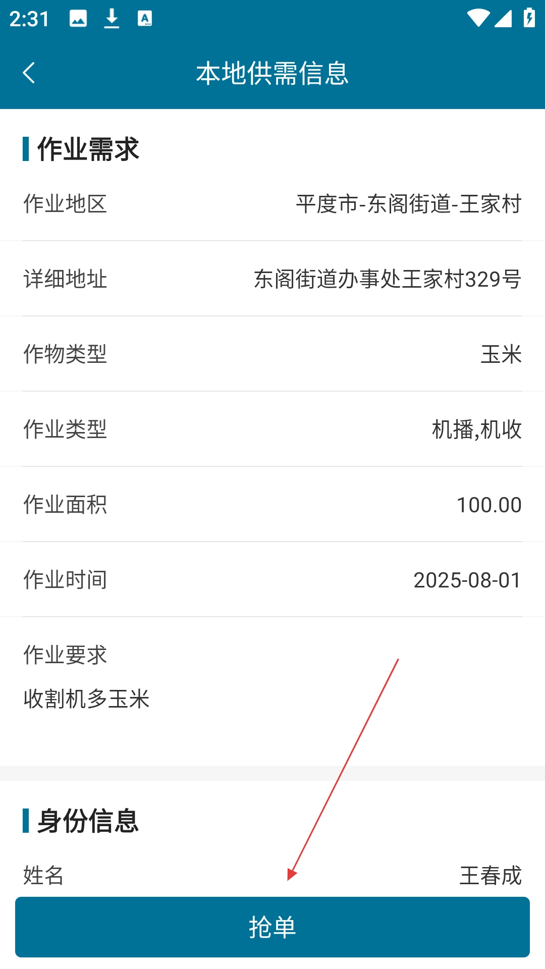 4、进入作业详情页面后,点击【抢单】按钮就能完成作业抢单的操作。