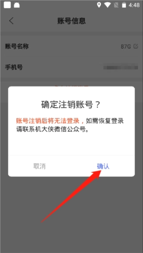 4、最后在弹出的窗口里选择右侧的确认按钮,就能顺利完成账号注销操作了。